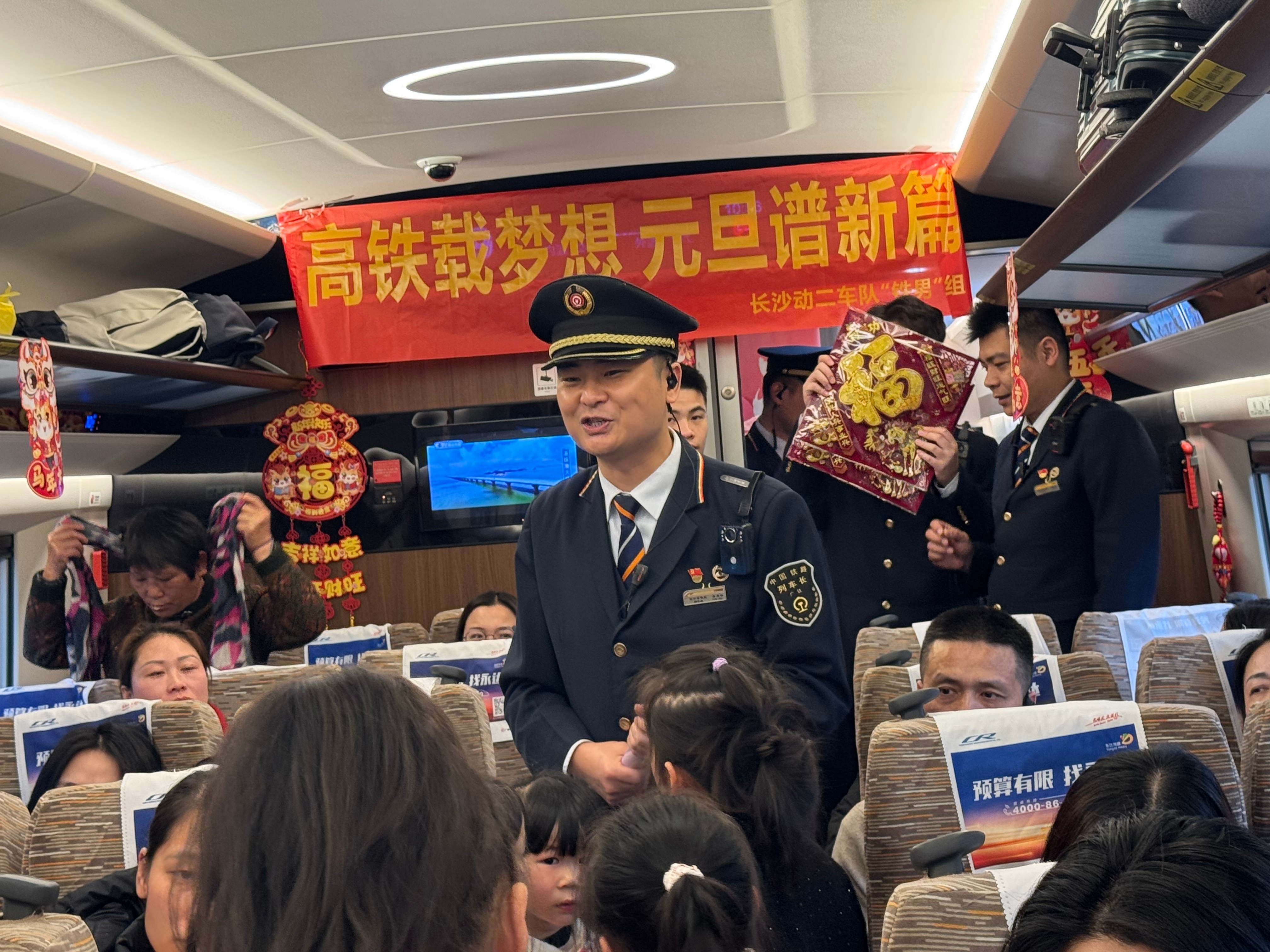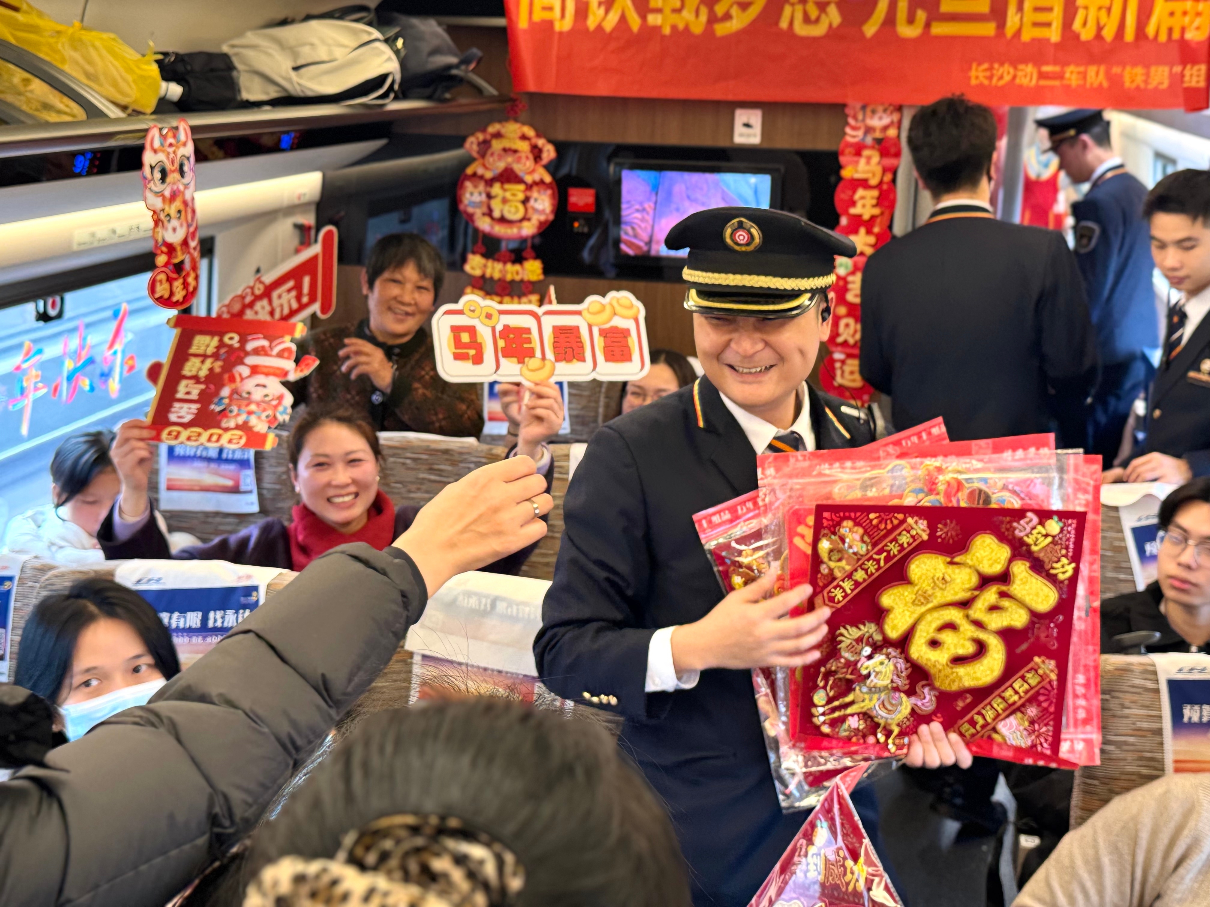 “我想要一张福字带回家贴门上!”一位戴眼镜的小朋友踮着脚尖,脆生生地喊道。列车员伍航宇笑着递上一张充满童趣的个性“福”字,小朋友举着红纸在车厢里开心转圈,引得众人欢笑连连。常年在长沙工作、返乡探亲的李先生,领到一幅遒劲有力的“福”字,小心翼翼折好揣进怀里:“把福气带回家,新年肯定更圆满!”